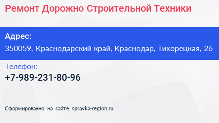 Ремонт Дорожно-Строительной Техники по адресу 350059, Краснодарский край, Краснодар, Тихорецкая, 26 в дальнейшем Организация, размещена в следующих категориях: