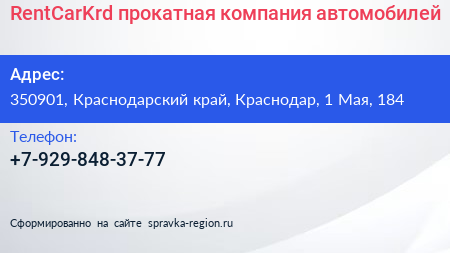 RentCarKrd, прокатная компания автомобилей по адресу 350901, Краснодарский край, Краснодар, 1 Мая, 184 в дальнейшем Организация, размещена в следующих категориях: