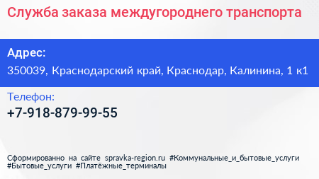 Служба заказа междугороднего транспорта по адресу 350039, Краснодарский край, Краснодар, Калинина, 1 к1 в дальнейшем Организация, размещена в следующих категориях: