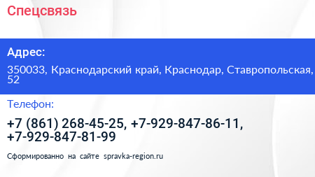 Спецсвязь по адресу 350033, Краснодарский край, Краснодар, Ставропольская, 52 в дальнейшем Организация, размещена в следующих категориях: