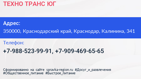 ТЕХНО ТРАНС ЮГ по адресу 350000, Краснодарский край, Краснодар, Калинина, 341 в дальнейшем Организация, размещена в следующих категориях: