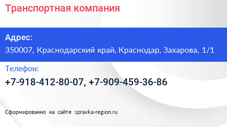 Транспортная компания по адресу 350007, Краснодарский край, Краснодар, Захарова, 1/1 в дальнейшем Организация, размещена в следующих категориях: