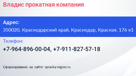 Владис, прокатная компания по адресу 350020, Краснодарский край, Краснодар, Красная, 176 к1 в дальнейшем Организация, размещена в следующих категориях: