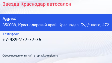 Звезда-Краснодар, автосалон по адресу 350038, Краснодарский край, Краснодар, Будённого, 472 в дальнейшем Организация, размещена в следующих категориях: