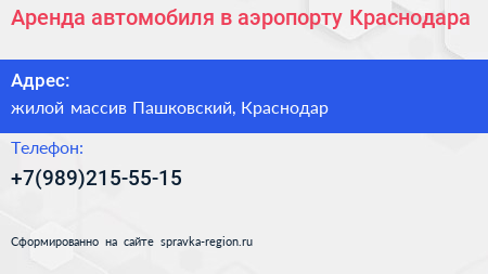 Аренда автомобиля в аэропорту Краснодара по адресу жилой массив Пашковский, Краснодар в дальнейшем Организация, размещена в следующих категориях: