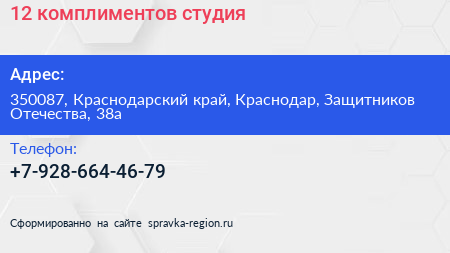12 комплиментов, студия по адресу 350087, Краснодарский край, Краснодар, Защитников Отечества, 38а в дальнейшем Организация, размещена в следующих категориях: