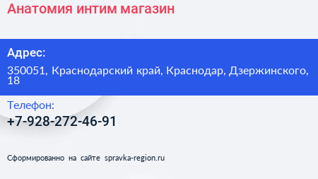 Анатомия, интим-магазин по адресу 350051, Краснодарский край, Краснодар, Дзержинского, 18 в дальнейшем Организация, размещена в следующих категориях: