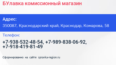 БУлавка, комиссионный магазин по адресу 350087, Краснодарский край, Краснодар, Комарова, 58 в дальнейшем Организация, размещена в следующих категориях: