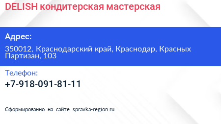 DELISH, кондитерская мастерская по адресу 350012, Краснодарский край, Краснодар, Красных Партизан, 103 в дальнейшем Организация, размещена в следующих категориях: