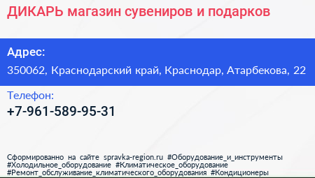 ДИКАРЬ, магазин сувениров и подарков по адресу 350062, Краснодарский край, Краснодар, Атарбекова, 22 в дальнейшем Организация, размещена в следующих категориях: