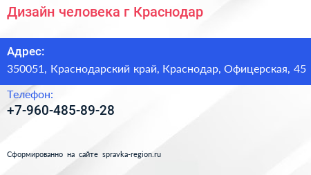 Дизайн человека, г. Краснодар по адресу 350051, Краснодарский край, Краснодар, Офицерская, 45 в дальнейшем Организация, размещена в следующих категориях: