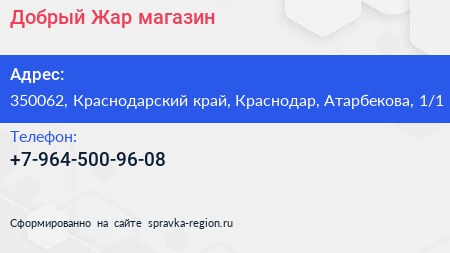Добрый Жар, магазин по адресу 350062, Краснодарский край, Краснодар, Атарбекова, 1/1 в дальнейшем Организация, размещена в следующих категориях: