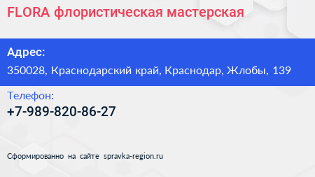 FLORA, флористическая мастерская по адресу 350028, Краснодарский край, Краснодар, Жлобы, 139 в дальнейшем Организация, размещена в следующих категориях: