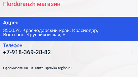 Flordoranzh, магазин по адресу 350059, Краснодарский край, Краснодар, Восточно-Кругликовская, 6 в дальнейшем Организация, размещена в следующих категориях: