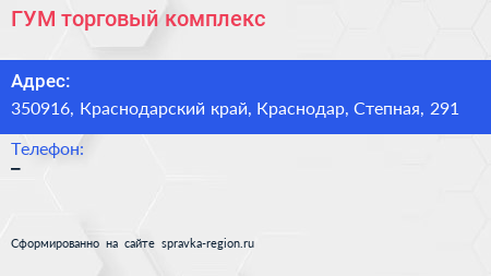 ГУМ, торговый комплекс по адресу 350916, Краснодарский край, Краснодар, Степная, 291 в дальнейшем Организация, размещена в следующих категориях: