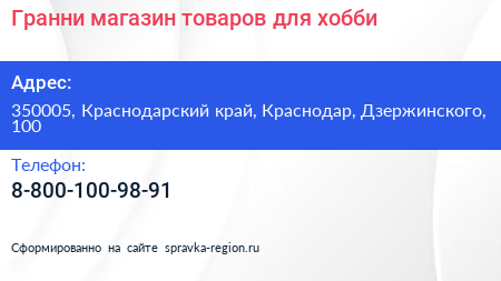 Гранни, магазин товаров для хобби по адресу 350005, Краснодарский край, Краснодар, Дзержинского, 100 в дальнейшем Организация, размещена в следующих категориях: