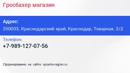 Гросбахер, магазин по адресу 350033, Краснодарский край, Краснодар, Товарная, 2/2 в дальнейшем Организация, размещена в следующих категориях: