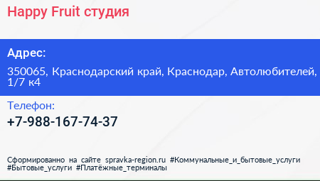 Happy Fruit, студия по адресу 350065, Краснодарский край, Краснодар, Автолюбителей, 1/7 к4 в дальнейшем Организация, размещена в следующих категориях: