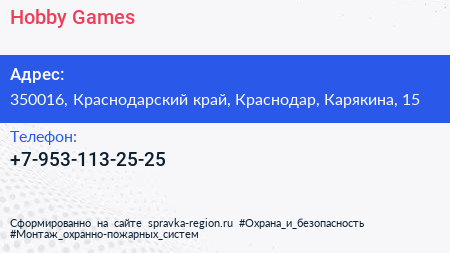 Hobby Games по адресу 350016, Краснодарский край, Краснодар, Карякина, 15 в дальнейшем Организация, размещена в следующих категориях: