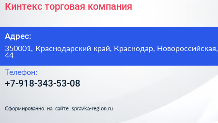 Кинтекс, торговая компания по адресу 350001, Краснодарский край, Краснодар, Новороссийская, 44 в дальнейшем Организация, размещена в следующих категориях: