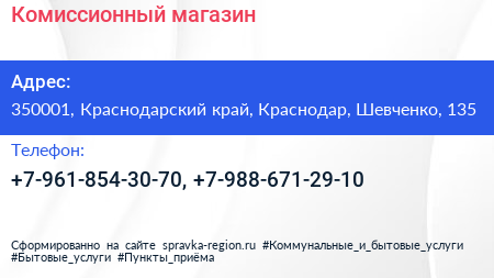 Комиссионный магазин по адресу 350001, Краснодарский край, Краснодар, Шевченко, 135 в дальнейшем Организация, размещена в следующих категориях: