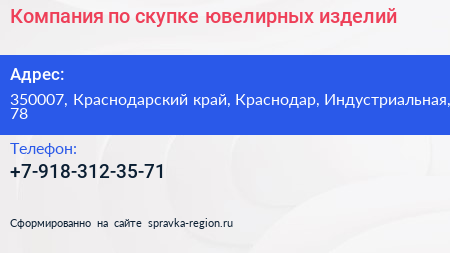 Компания по скупке ювелирных изделий по адресу 350007, Краснодарский край, Краснодар, Индустриальная, 78 в дальнейшем Организация, размещена в следующих категориях: