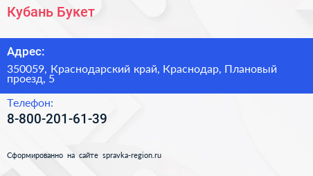 Кубань Букет по адресу 350059, Краснодарский край, Краснодар, Плановый проезд, 5 в дальнейшем Организация, размещена в следующих категориях: