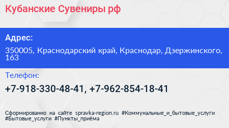 Кубанские-Сувениры.рф по адресу 350005, Краснодарский край, Краснодар, Дзержинского, 163 в дальнейшем Организация, размещена в следующих категориях:
