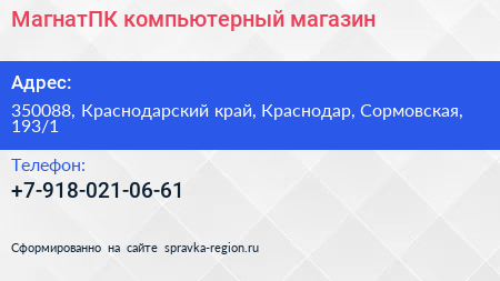 МагнатПК, компьютерный магазин по адресу 350088, Краснодарский край, Краснодар, Сормовская, 193/1 в дальнейшем Организация, размещена в следующих категориях: