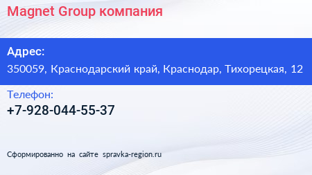 Magnet Group, компания по адресу 350059, Краснодарский край, Краснодар, Тихорецкая, 12 в дальнейшем Организация, размещена в следующих категориях: