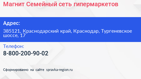Магнит Семейный, сеть гипермаркетов по адресу 385121, Краснодарский край, Краснодар, Тургеневское шоссе, 17 в дальнейшем Организация, размещена в следующих категориях: