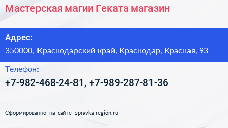Мастерская магии Геката, магазин по адресу 350000, Краснодарский край, Краснодар, Красная, 93 в дальнейшем Организация, размещена в следующих категориях: