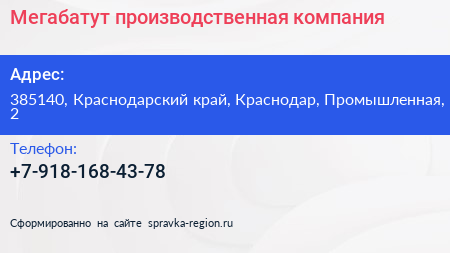 Мегабатут, производственная компания по адресу 385140, Краснодарский край, Краснодар, Промышленная, 2 в дальнейшем Организация, размещена в следующих категориях: