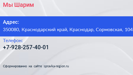 Мы Шарим по адресу 350080, Краснодарский край, Краснодар, Сормовская, 104 в дальнейшем Организация, размещена в следующих категориях: