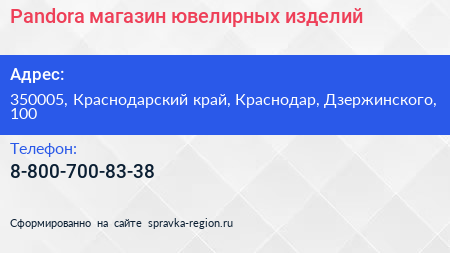 Pandora, магазин ювелирных изделий по адресу 350005, Краснодарский край, Краснодар, Дзержинского, 100 в дальнейшем Организация, размещена в следующих категориях: