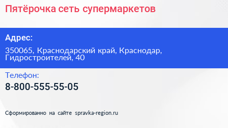 Пятёрочка, сеть супермаркетов по адресу 350065, Краснодарский край, Краснодар, Гидростроителей, 40 в дальнейшем Организация, размещена в следующих категориях: