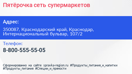 Пятёрочка, сеть супермаркетов по адресу 350087, Краснодарский край, Краснодар, Интернациональный бульвар, 107/2 в дальнейшем Организация, размещена в следующих категориях: