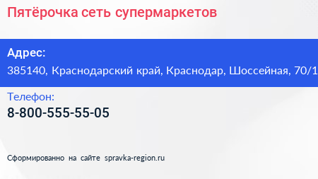 Пятёрочка, сеть супермаркетов по адресу 385140, Краснодарский край, Краснодар, Шоссейная, 70/1 в дальнейшем Организация, размещена в следующих категориях: