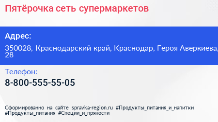 Пятёрочка, сеть супермаркетов по адресу 350028, Краснодарский край, Краснодар, Героя Аверкиева, 28 в дальнейшем Организация, размещена в следующих категориях:
