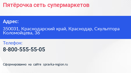 Пятёрочка, сеть супермаркетов по адресу 350031, Краснодарский край, Краснодар, Скульптора Коломойцева, 36 в дальнейшем Организация, размещена в следующих категориях: