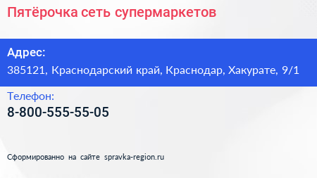 Пятёрочка, сеть супермаркетов по адресу 385121, Краснодарский край, Краснодар, Хакурате, 9/1 в дальнейшем Организация, размещена в следующих категориях: