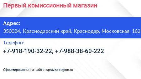 Первый комиссионный магазин по адресу 350024, Краснодарский край, Краснодар, Московская, 162 в дальнейшем Организация, размещена в следующих категориях: