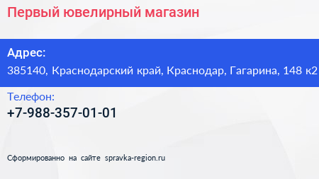 Первый ювелирный, магазин по адресу 385140, Краснодарский край, Краснодар, Гагарина, 148 к2 в дальнейшем Организация, размещена в следующих категориях: