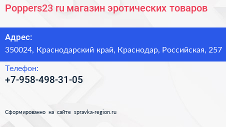 Poppers23.ru, магазин эротических товаров по адресу 350024, Краснодарский край, Краснодар, Российская, 257 в дальнейшем Организация, размещена в следующих категориях:
