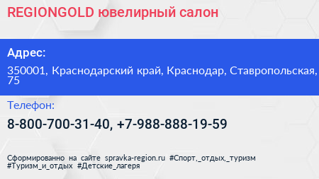 REGIONGOLD, ювелирный салон по адресу 350001, Краснодарский край, Краснодар, Ставропольская, 75 в дальнейшем Организация, размещена в следующих категориях:
