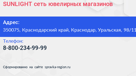 SUNLIGHT, сеть ювелирных магазинов по адресу 350075, Краснодарский край, Краснодар, Уральская, 98/11 в дальнейшем Организация, размещена в следующих категориях: