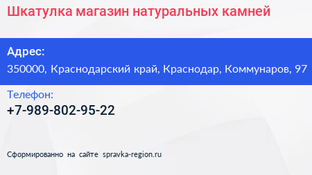 Шкатулка, магазин натуральных камней по адресу 350000, Краснодарский край, Краснодар, Коммунаров, 97 в дальнейшем Организация, размещена в следующих категориях: