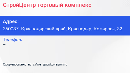 СтройЦентр, торговый комплекс по адресу 350087, Краснодарский край, Краснодар, Комарова, 32 в дальнейшем Организация, размещена в следующих категориях: