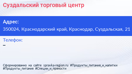 Суздальский, торговый центр по адресу 350024, Краснодарский край, Краснодар, Суздальская, 21 в дальнейшем Организация, размещена в следующих категориях: