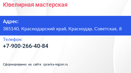 Ювелирная мастерская по адресу 385140, Краснодарский край, Краснодар, Советская, 8 в дальнейшем Организация, размещена в следующих категориях: